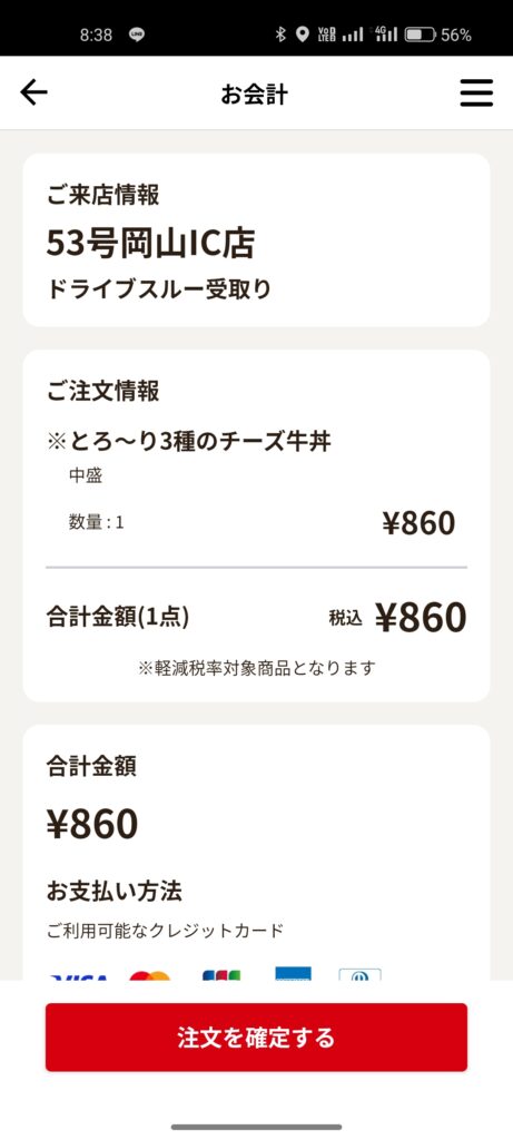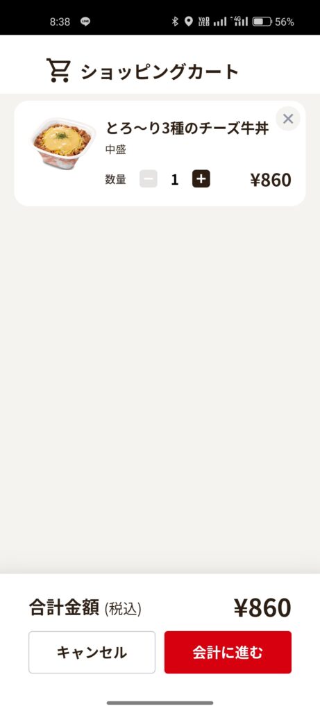 メニューを選択します。今回の参考例では「とろ〜り3種のチーズ牛丼」「中盛り」を選択しました。