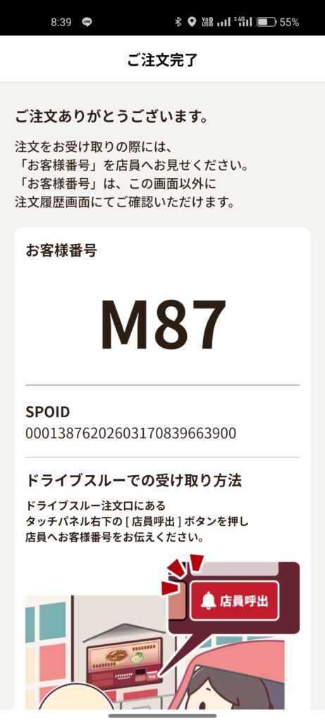 この番号で受け取りに行きます。店内の混雑状況にもよりますが、料理が出来上がってから横井上、津高、田益辺りで15分くらいでお届けします。