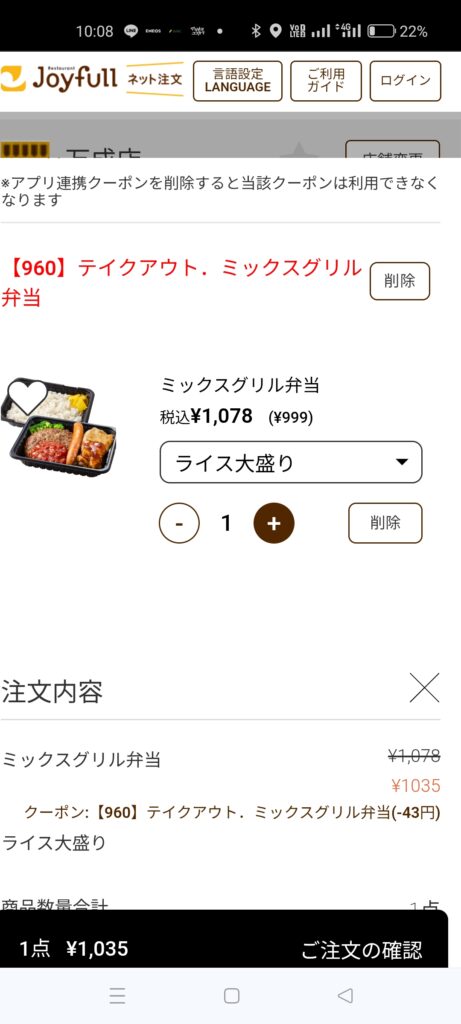 ジョイフル万成店での注文例です。